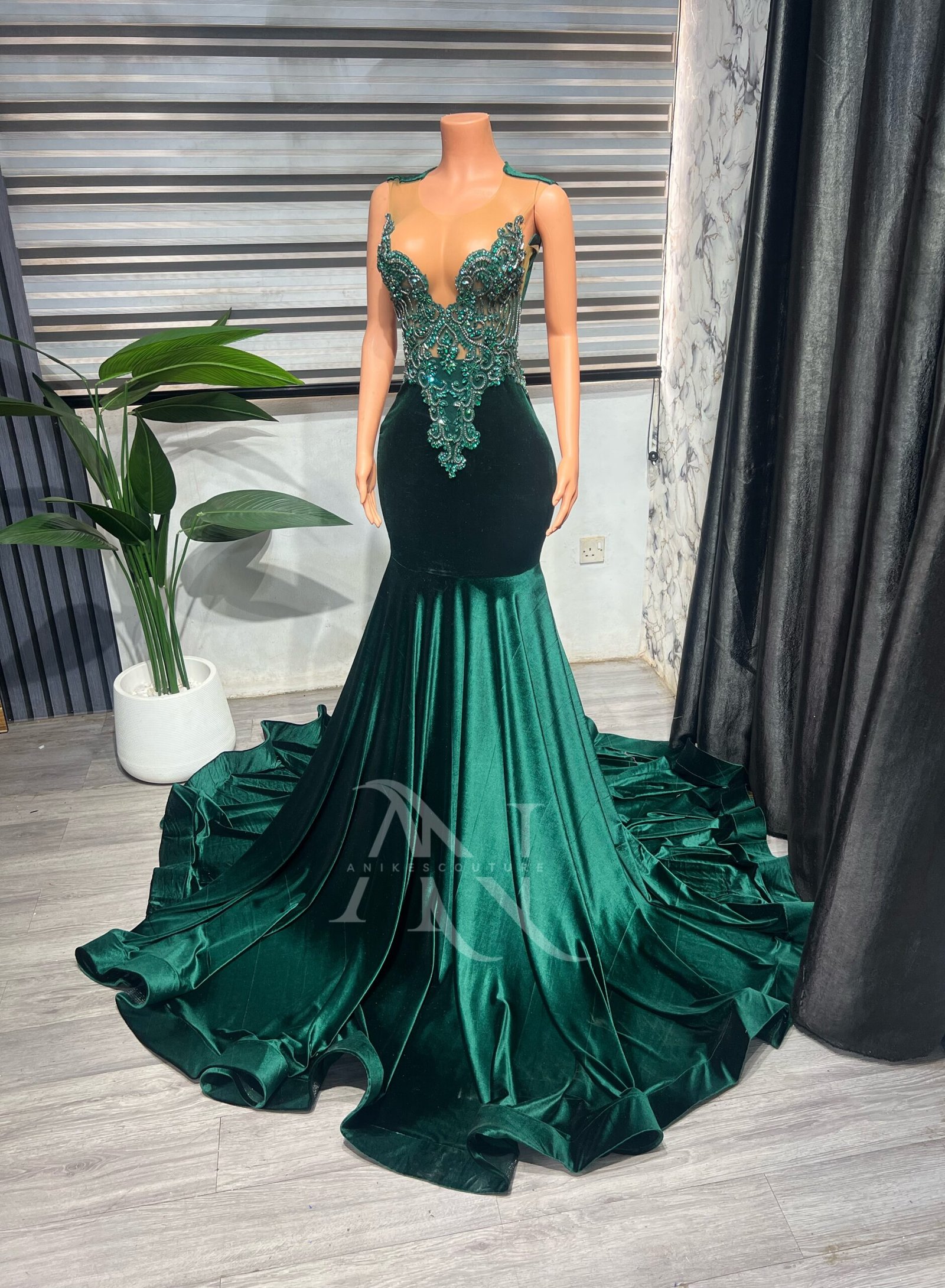 Elevate your style with this luxurious green dress, crafted to exude sophistication and glamour at every angle. Perfect for proms, wedding receptions, or any special occasion, this gown is designed to captivate and turn heads. Every detail has been thoughtfully designed to create a piece that radiates elegance and refined beauty.