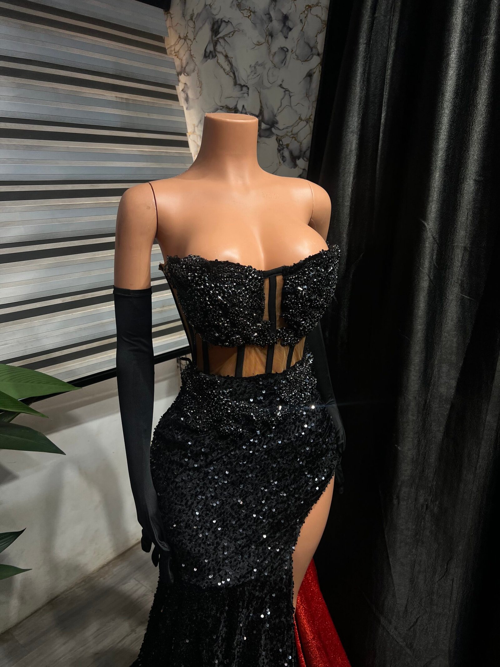 Elevate your style with this luxurious black dress, crafted to exude elegance and glamour at every angle. Perfect for proms, wedding receptions, or any special occasion, this gown is designed to captivate and turn heads. Every detail has been thoughtfully designed to create a piece that radiates sophistication and refined beauty.